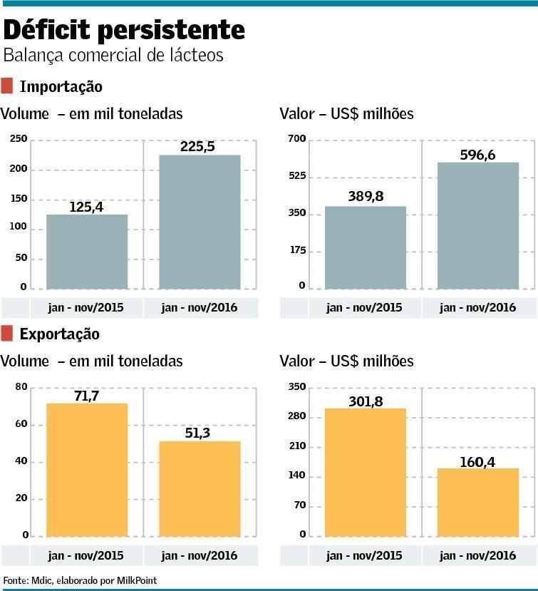 Entre janeiro e novembro deste ano, o déficit da balança brasileira de lácteos ficou em US$ 436 milhões, mais de três vezes o saldo negativo registrado em todo o ano de 2015. O volume importado no período teve alta significativa (100 mil toneladas a mais) em relação ao janeiro a novembro de 2015, somando 225,5 mil toneladas. Tudo isso em decorrência, sobretudo, da menor oferta de leite no mercado interno.
