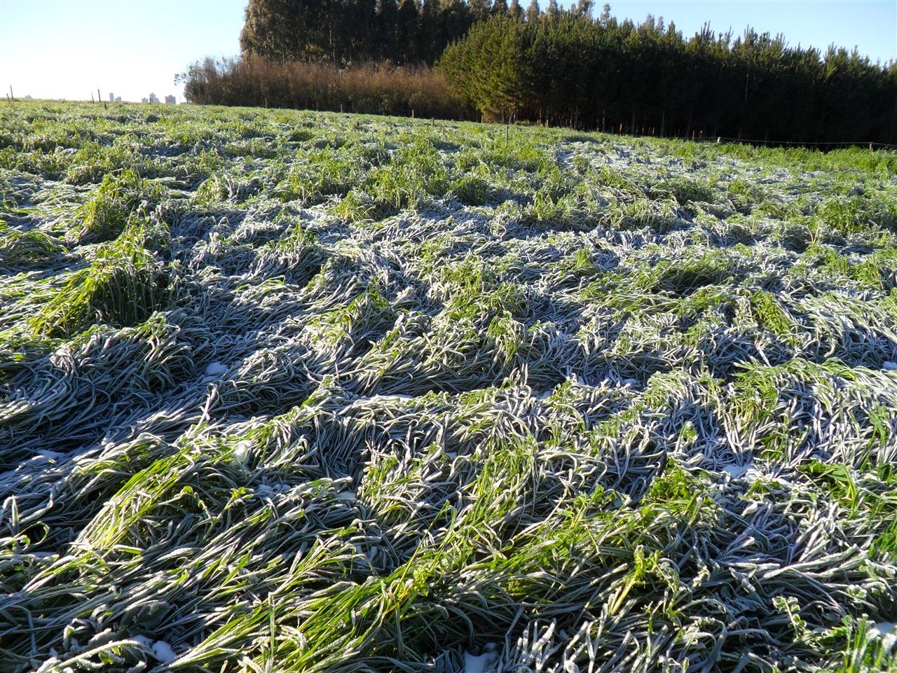 Foto enviada pelo Veterinário Mailson Poczynek de uma pastagem de aveia e azevém, após neve e geada. Foto tirada na unidade didática de bovinocultura de leite da Unicentro, Campus Cedeteg em Guarapuava-PR.