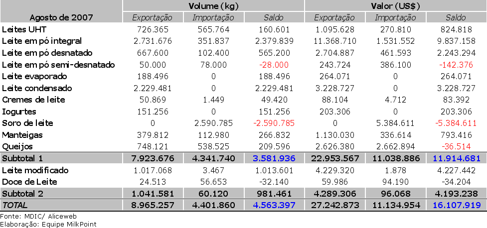 Tabela 1. Exportações e importações de lácteos em agosto.