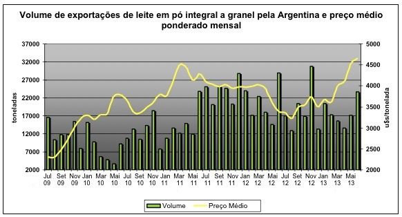 No primeiro semestre de 2013, o volume declarado de exportações de leite em pó integral a granel foi de 104.718 toneladas por um valor FOB total de US$ 434,6 milhões versus 121.941 toneladas por US$ 463,3 milhões no mesmo período de 2012. No primeiro trimestre de 2013 – segundo os últimos dados oficiais publicados -, a captação de leite nas principais indústrias lácteas argentinas foi de 1,636 bilhão de litros, 9,5% a menos que no mesmo período de 2012.