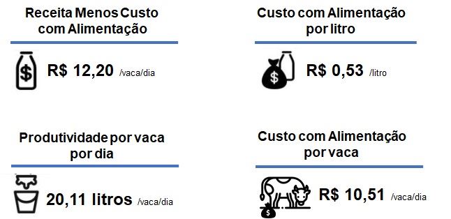 A produção média/vaca/dia foi de 20,1 litros/vaca e o custo diário com alimentação médio foi de R$ 10,5/vaca. Na figura, encontra-se o resumo com os principais indicadores do módulo “gestão na Fazenda” do mês de outubro.
