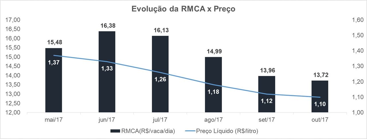 É interessante reforçar que, além desse aumento dos custos dos concentrados, a RMCA segue sendo penalizada pela queda nos valores pagos aos produtores nos últimos meses. Confira abaixo a evolução RMCA x preço desde o início do levantamento, considerando apenas os produtores que participaram em todos os meses (gráfico 1).