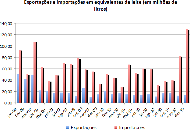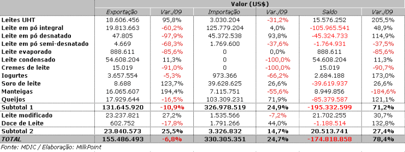 O saldo da balança comercial de 2010, em termos de equivalente de leite, apresentou um aumento de 7,1% no déficit, para 499,19 milhões de litros. Em outras palavras, tivemos quase 500 milhões de litros a mais de leite no mercado nacional em 2010. Fruto de 680,95 milhões de litros importados menos os 181,76 milhões exportados.