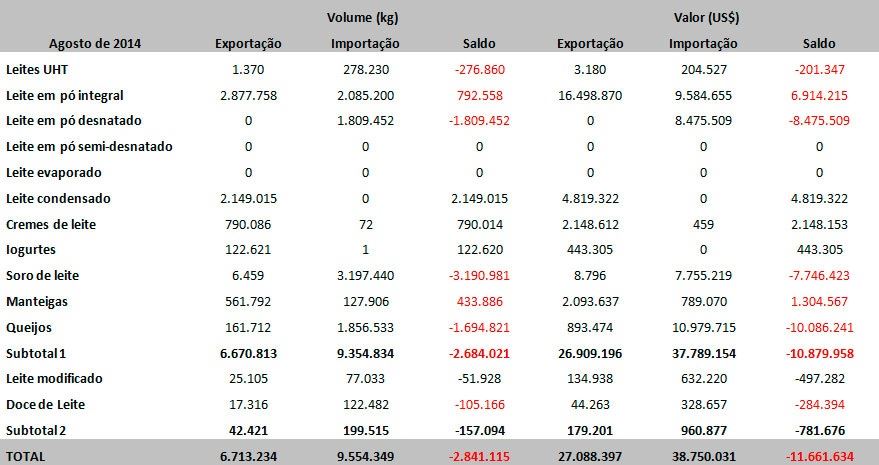 Tabela 1: Balança Comercial de Lácteos – Agosto de 2014