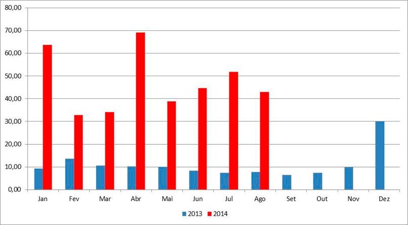 Na análise do volume importado em equivalente-leite (a quantidade de leite utilizada para produzir um quilo de determinado produto), foram internalizados 57,5 milhões de litros (redução de 22,4% com relação a julho). As exportações em equivalente-leite também apresentaram diminuição com relação ao mês anterior de 17,4%, com o valor de 42,9 milhões de litros, mas ainda assim continua em patamares bem acima dos praticados no mesmo período do ano anterior (+390,0% no acumulado janeiro a agosto).