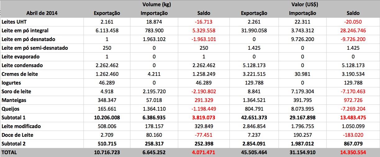 Tabela: Balança Comercial de Lácteos – Março de 2014