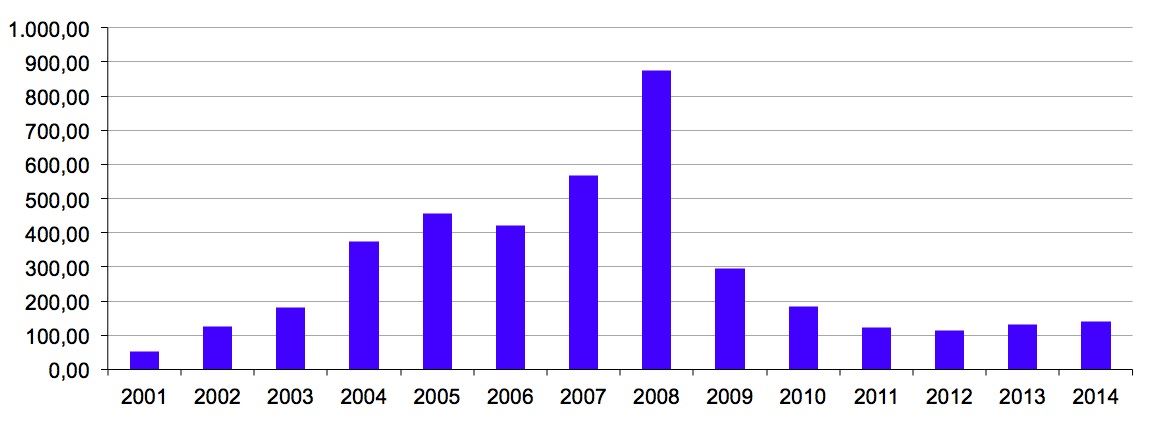 Gráfico: Quantidade de equivalente-leite exportada anual (milhões de litros de leite)