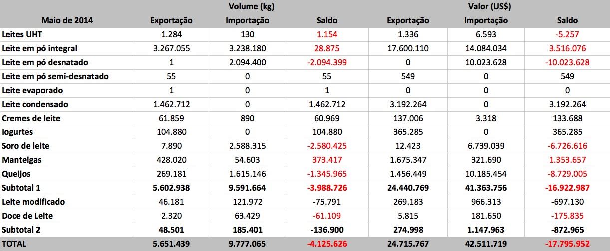 Tabela: Balança Comercial de Lácteos – Maio de 2014