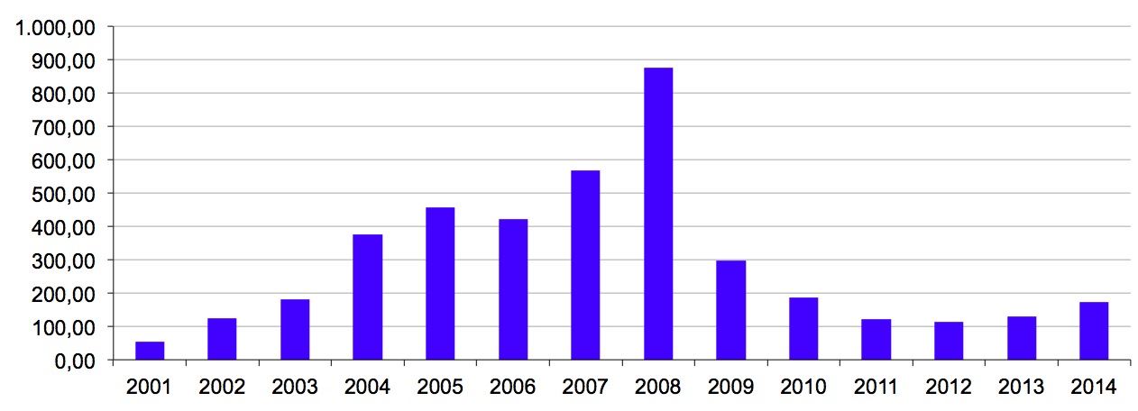 Gráfico: Quantidade de equivalente-leite exportada anual (milhões de litros de leite)