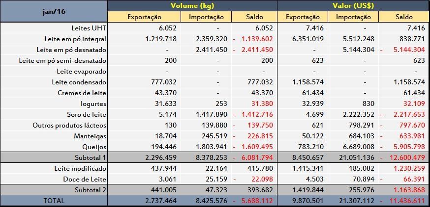 O maior volume das exportações continua a ser de leite em pó integral. No entanto, os embarques diminuíram expressivamente: em outubro, o volume de exportação de leite em pó integral havia sido de 5.800 toneladas, já em janeiro pouco mais de 1.200 toneladas foram exportadas, uma queda de quase 80%.
