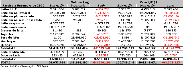 Tabela 1. Exportações e importações de lácteos em 2009.