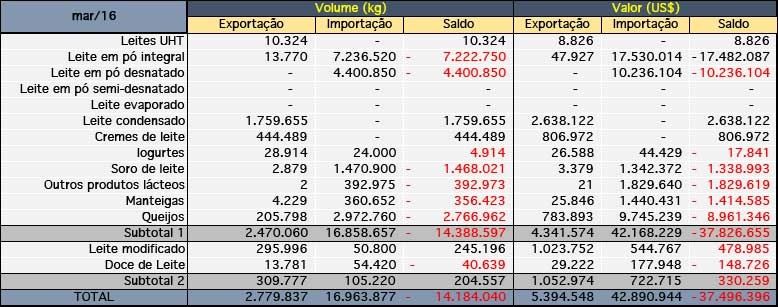 As exportações apresentaram queda de -56,1% em volume e de -72,1% em valor. Em março, foram exportados US$5,4 milhões de dólares de produtos lácteos, contra US$19,3 milhões em fevereiro. Na comparação com março de 2015, a queda nas exportações, em volume, foi de 62%