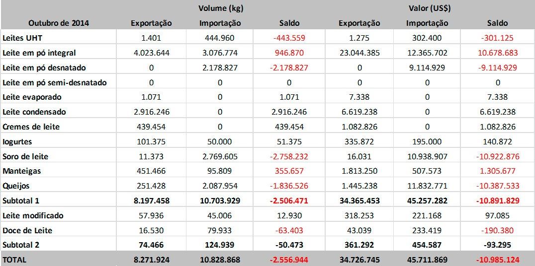 Tabela 1: Balança Comercial de Lácteos – Outubro de 2014