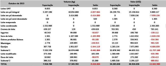 Tabela 1 – Balança comercial de lácteos – Outubro de 2015 (clique na imagem para ampliar).