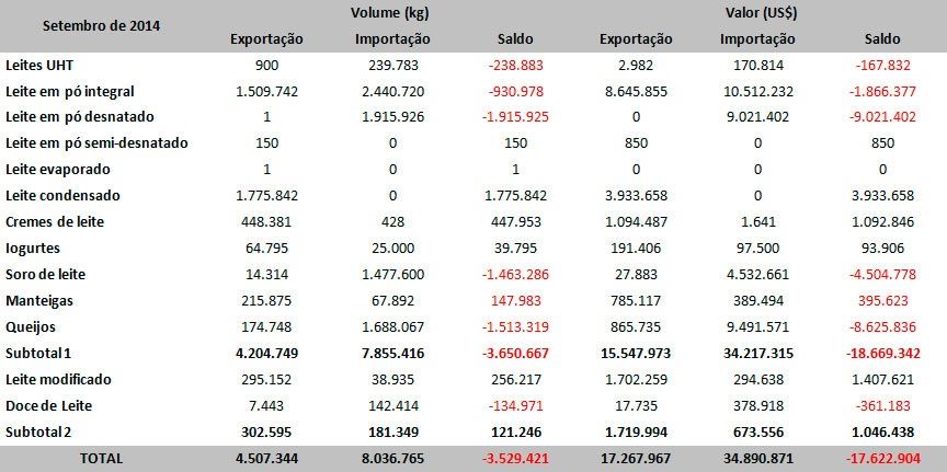 Tabela 1: Balança Comercial de Lácteos – Setembro de 2014