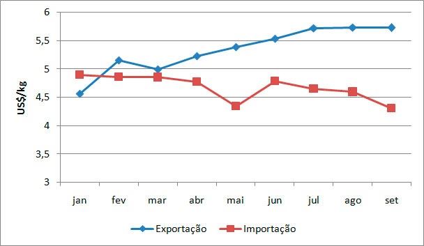 Gráfico 2: Preços de leite em pó (US$/kg) - importações e exportações brasileiras