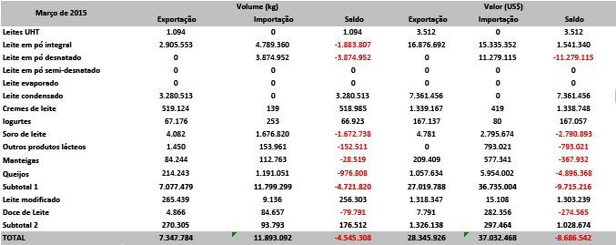 Tabela 1: Balança Comercial de Lácteos – Março de 2015