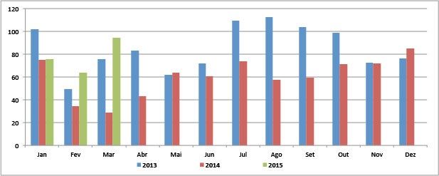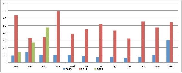 Gráfico 1: 2015 x 2014 x 2013 - Importações em equivalente leite (milhões litros/mês)
