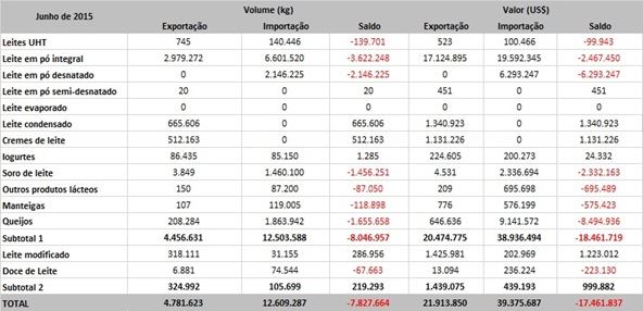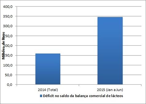 De janeiro a junho deste ano, o déficit acumulado da balança comercial de lácteos em equivalente-leite é de cerca de 346 milhões de litros, é maior que o dobro do apresentado no total de 2014, que foi de 159 milhões de litros.