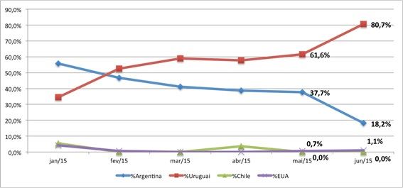 As importações de leite em pó, tanto integral quanto desnatado, tiveram origem majoritariamente do Uruguai (80,7%), seguido por Argentina (18,2%); os outros 1,1% foram importados dos EUA. Interessante notar o crescimento da participação do Uruguai, ao mesmo tempo em que as importações da Argentina tem diminuído.
