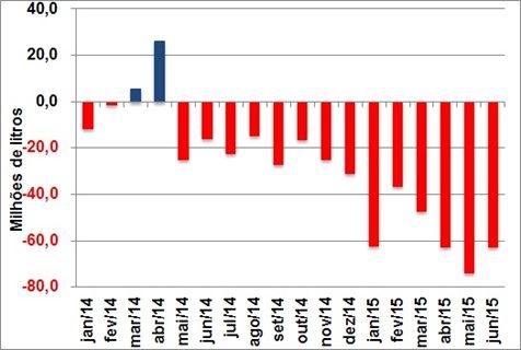 Os gráficos 2 e 3 a seguir apresentam este cenário, mostrando a comparação entre o déficit total de 2014 x o acumulado de janeiro a junho de 2015 (gráfico 2) e o histórico do saldo da balança de lácteos 2014 x 2015.
