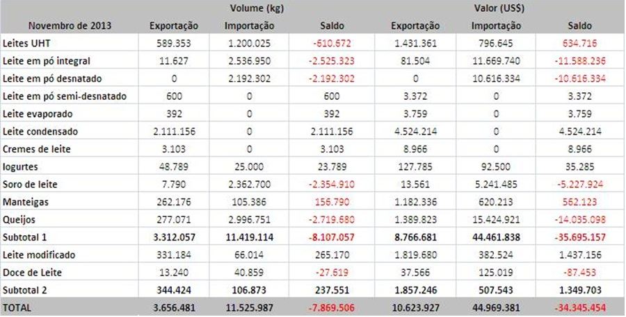Tabela 1 - Balança Comercial de Lácteos – Novembro de 2013