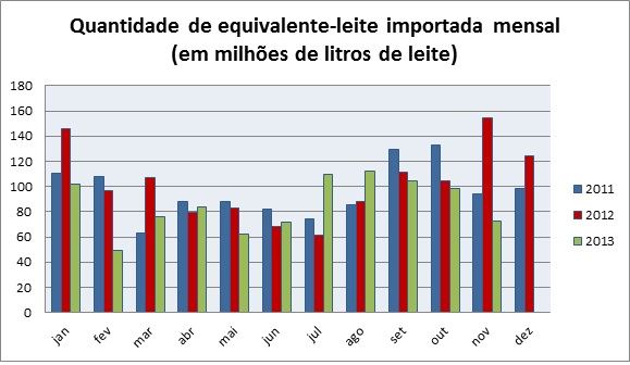 Ao analisarmos o volume importado em equivalente-leite (a quantidade de leite utilizada para produzir um quilo de determinado produto) observa-se que foram internalizados 72,4 milhões de litros, queda de 26,6% frente às importações de outubro. Na comparação do acumulado anual, o volume importado até novembro de 2013 (941,6 milhões de litros de leite) foi 14,3% menor que durante o mesmo período de 2012.