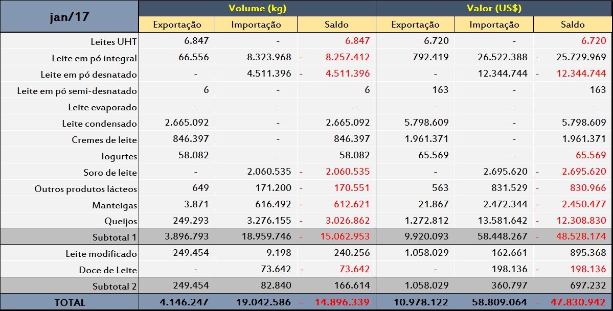 O ano iniciou com um déficit na balança comercial de lácteos em equivalente-leite de cerca de 131 milhões de litros, 189% proporcionalmente maior que o início de 2016, sendo o volume exportado de 22 milhões de litros e o importado de 152 milhões de litros, ambos os dados estimados em equivalente-leite.