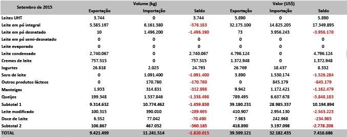 Tabela 1 – Balança comercial de lácteos – Setembro de 2015 (clique na imagem para ampliar).