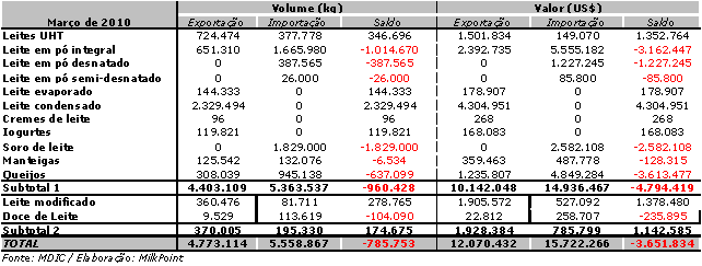 Tabela 1. Exportações e importações de lácteos em março de 2010.