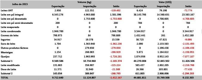 Tabela 1 – Balança comercial de lácteos – julho de 2015.