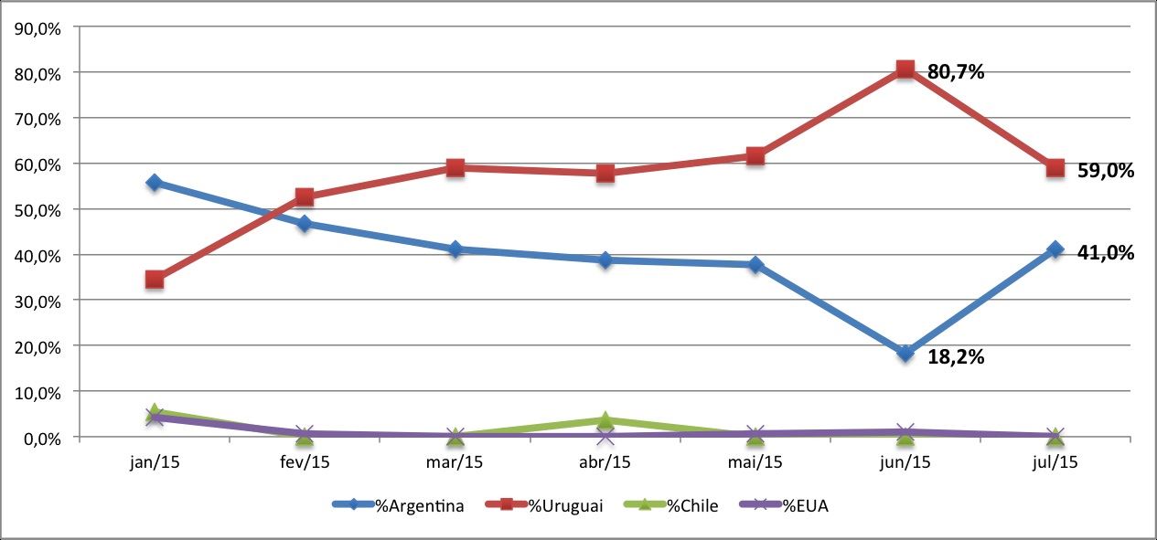As importações de leite em pó, tanto integral quanto desnatado, tiveram origem majoritariamente do Uruguai (59,0%), seguido por Argentina (41,0%). Neste mês, as importações provenientes da Argentina voltaram a crescer, após um mês de expressiva queda, enquanto as do Uruguai apresentaram queda.