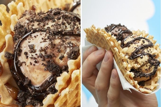 Os gulosos podem incrementar a sobremesa com duas bolas de qualquer um dos sabores disponíveis, além da calda quente de caramelo e farofa de cookies.