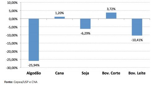 Estes dados fazem parte de estudo da Confederação da Agricultura e Pecuária do Brasil (CNA) e Centro de Estudos Avançados em Economia Aplicada (Cepea), que analisou o comportamento do PIB dos cinco produtos, tendo como referência a conjuntura econômica do período, com base no desempenho dos elos da cadeia produtiva: insumos, atividade primária (dentro da porteira), agroindústria e serviços (distribuição).