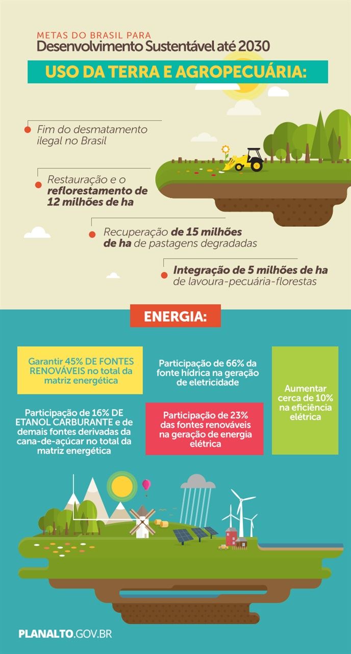 A proposta do Brasil prevê reduzir as emissões de gases do efeito estufa em 37% até 2025 e em 43% até 2030. Para isso, destacou a presidenta, o país prevê chegar ao fim do desmatamento ilegal em 2030, além de restaurar e reflorestar 12 milhões de hectares; recuperar 15 milhões de hectares de pastagens degradadas e integrar cinco milhões de hectares de lavoura, pastagem e pecuária.