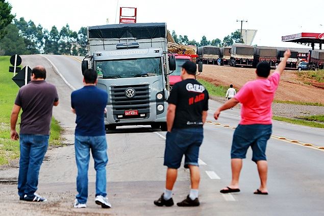 Na rodovia estadual PRC-280, região de Pato Branco, caminhões ocupam o acostamento na altura do km 175, desde às 6h30. A polícia rodoviária não informou a quantidade de caminhões envolvidos na paralisação, mas disse que o trânsito está liberado para veículos que não sejam de carga.