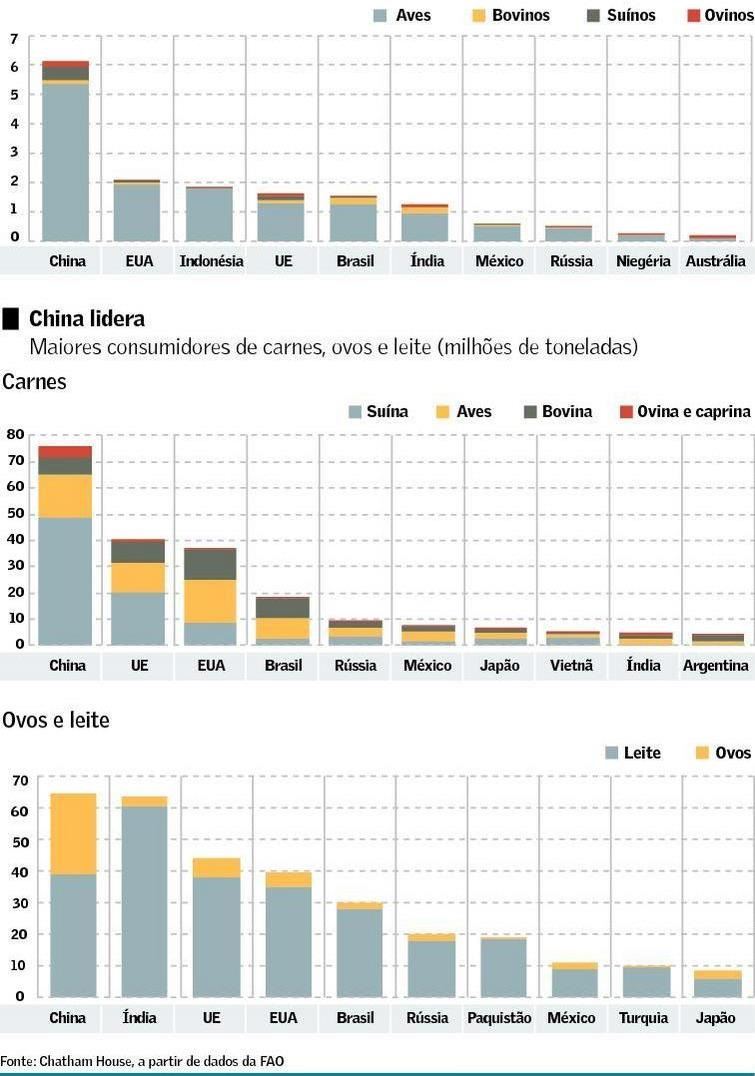 Atualmente, os maiores consumidores de carnes são China, União Europeia (UE), EUA e Brasil. Os maiores consumidores de lácteos são China, Índia, UE e EUA. Os dois países onde o consumo de carnes mais deve aumentar são China e o Brasil - com a diferença de que na China vai ser quatro vezes maior, em termos absolutos.