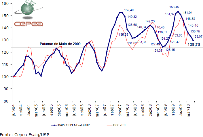 Gráfico 1. ICAP-L/Cepea - Índice de Captação de Leite - maio/10 (Base100=Junho/2004).