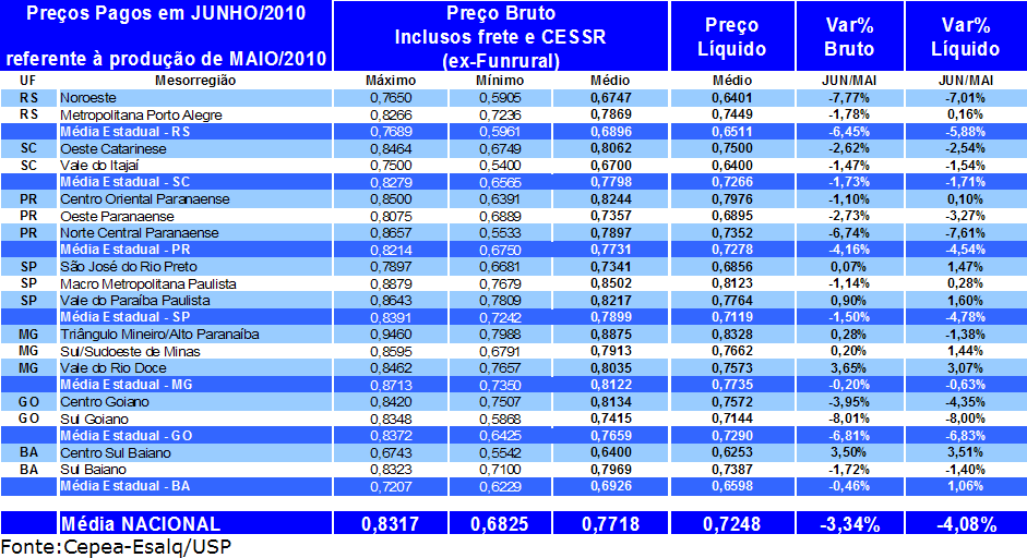Tabela 1. Preços pagos pelos laticínios (brutos) e recebidos pelos produtores (líquidos) em Junho/10 referentes ao leite entregue em Maio/10.