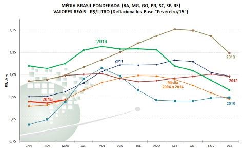 Gráfico 1 - Preços pagos ao produtor (em R$/L) - média Brasil