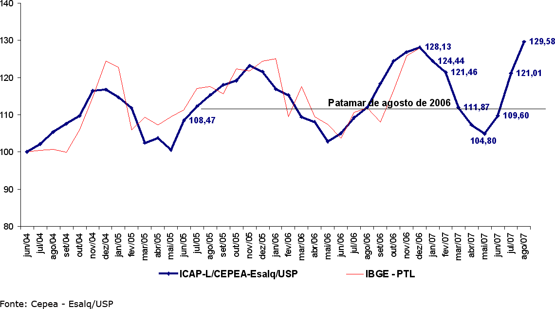 Gráfico 1. ICAP-L/Cepea - Índice de Captação de Leite (Junho de 2004 = 100) - Agosto/07.