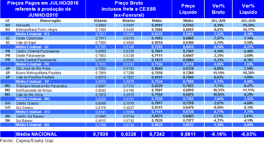 Quanto ao preço pago aos produtores, houve nova redução em julho (referente à produção entregue em junho). Agora, a queda foi de 6,16%, equivalente a 4,7 centavos por litro, com a média bruta a R$ 0,7242/litro. Esse valor passa, então, a representar queda de 6,17% em relação à média nominal do mesmo período de 2009 e de 3% sobre a de julho de 2008. A média nacional do preço do leite considera os estados de RS, PR, SC, SP, MG, GO e BA. Além do aumento da produção na média dos estados, agentes consultados pelo Cepea destacam também a influência da fraqueza do mercado de leite UHT, das elevadas importações e do fraco desempenho das exportações.