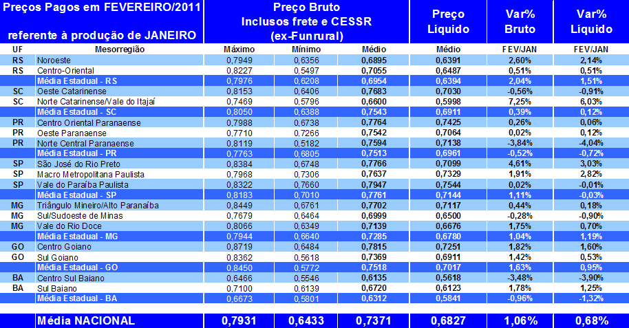 Tabela 1. Preços pagos pelos laticínios (brutos) e recebidos pelos produtores (líquidos) em Fevereiro/11 referentes ao leite entregue em Janeiro/10.