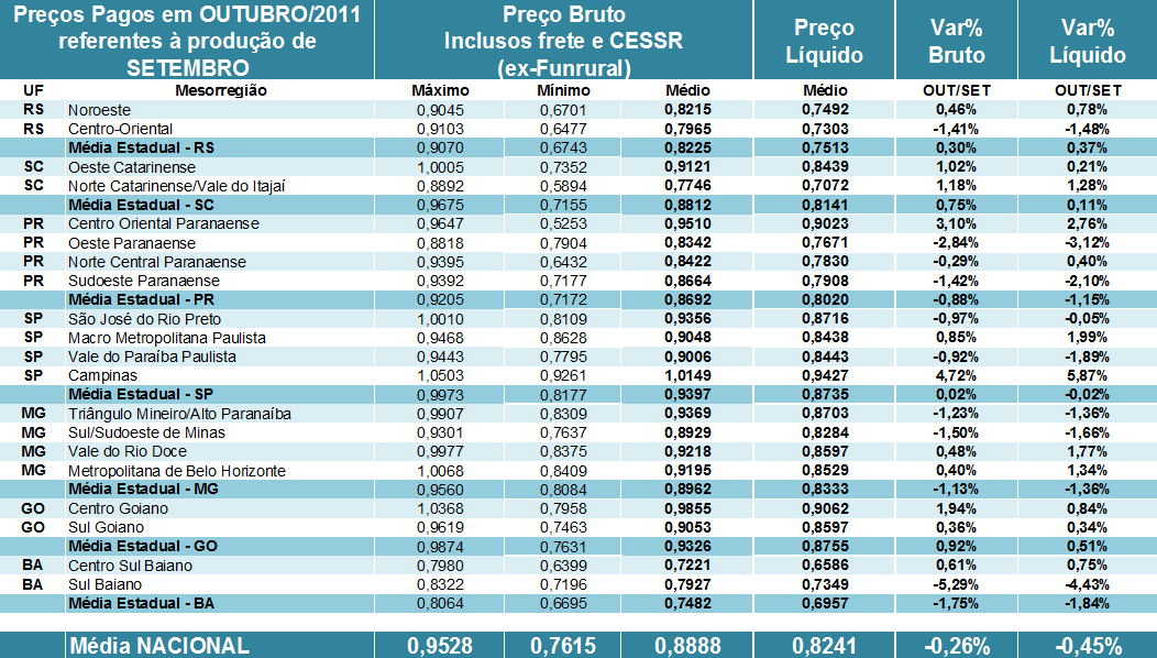 Tabela 1. Preços pagos pelos laticínios (brutos) e recebidos pelos produtores (líquidos) em OUTUBRO/11 referentes ao leite entregue em SETEMBRO/11.