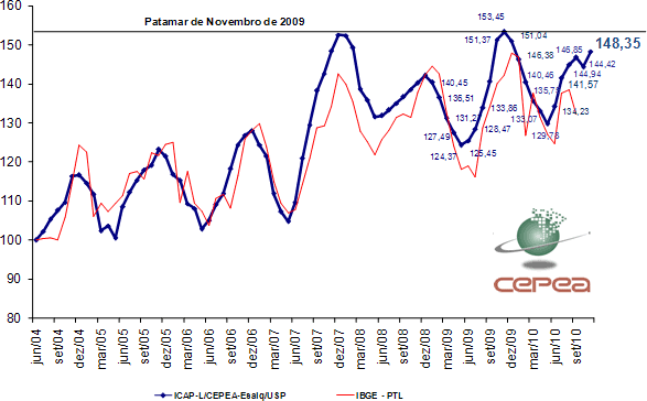 Gráfico 1: ICAP-L/Cepea - Índice de Captação de Leite - NOVEMBRO/10. (Base 100=Junho/2004).
