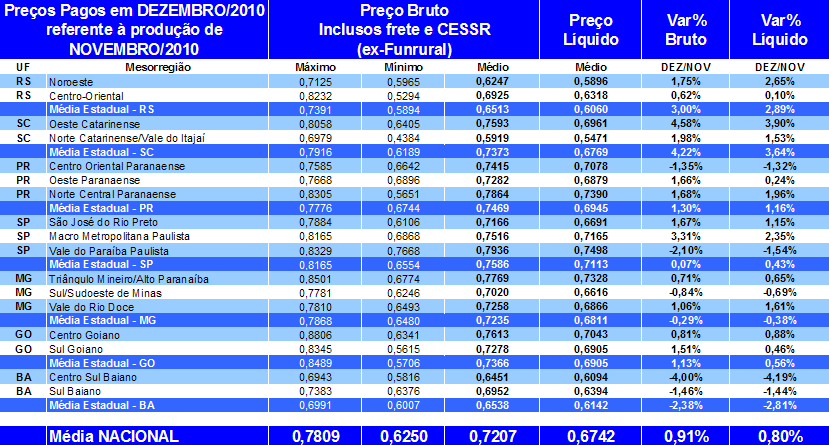 Tabela 1 - Preços pagos pelos laticínios (brutos) e recebidos pelos produtores (líquidos) em DEZEMBRO/10 referentes ao leite entregue em NOVEMBRO/10. Fonte: Cepea-Esalq/USP.