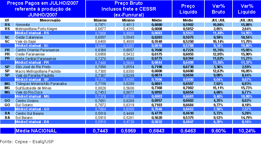 Tabela 1. Preços pagos pelos laticínios (brutos) e recebidos pelos produtores (líquidos) em julho, referente ao leite entregue em junho de 2007.