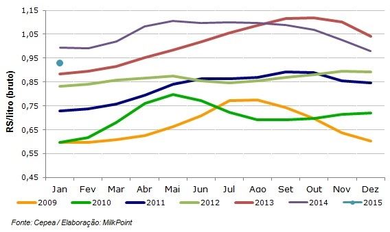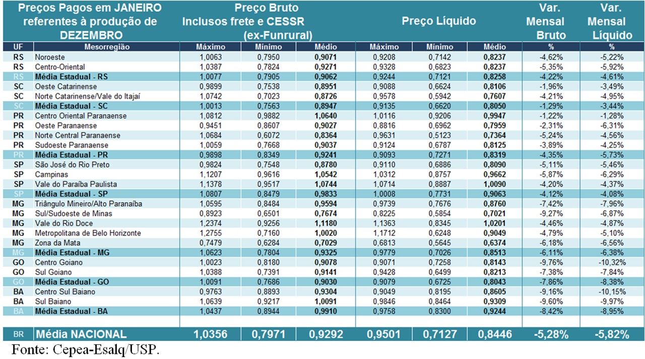 Em janeiro, a “média Brasil” líquida (não inclui frete nem impostos) foi de R$ 0,8446/litro, redução de 5,8% ou de 5,2 centavos de Real por litro na comparação com dezembro/14 e de 10,8% em relação a janeiro/14, em termos reais (deflacionados pelo IPCA de dez/14). O preço bruto médio (inclui frete e impostos - pago ao produtor) foi de R$ 0,9292/litro, queda de 5,3% ou também 5,2 centavos frente ao mês anterior.