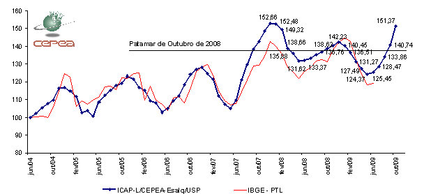 Gráfico 1. ICAP-L/Cepea - Índice de Captação de Leite - OUTUBRO/09. (Base 100=Junho/2004).