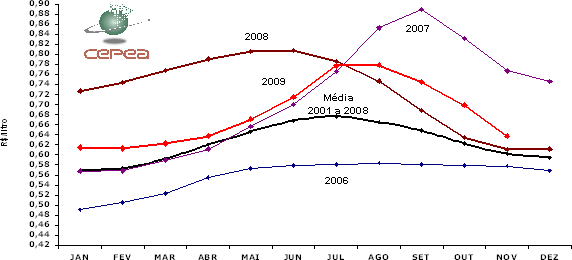 Mesmo com a retração dos preços, a média nacional do leite pago ao produtor ainda está 8,3% superior à de novembro do ano passado (R$ 0,5883/l). De janeiro a novembro, os preços pagos aos produtores tiveram média de R$ 0,6750/l, cerca de 3% inferior à do mesmo período de 2008. Apesar disso, no acumulado até outubro, a captação também está 3% menor que em igual período do ano passado.